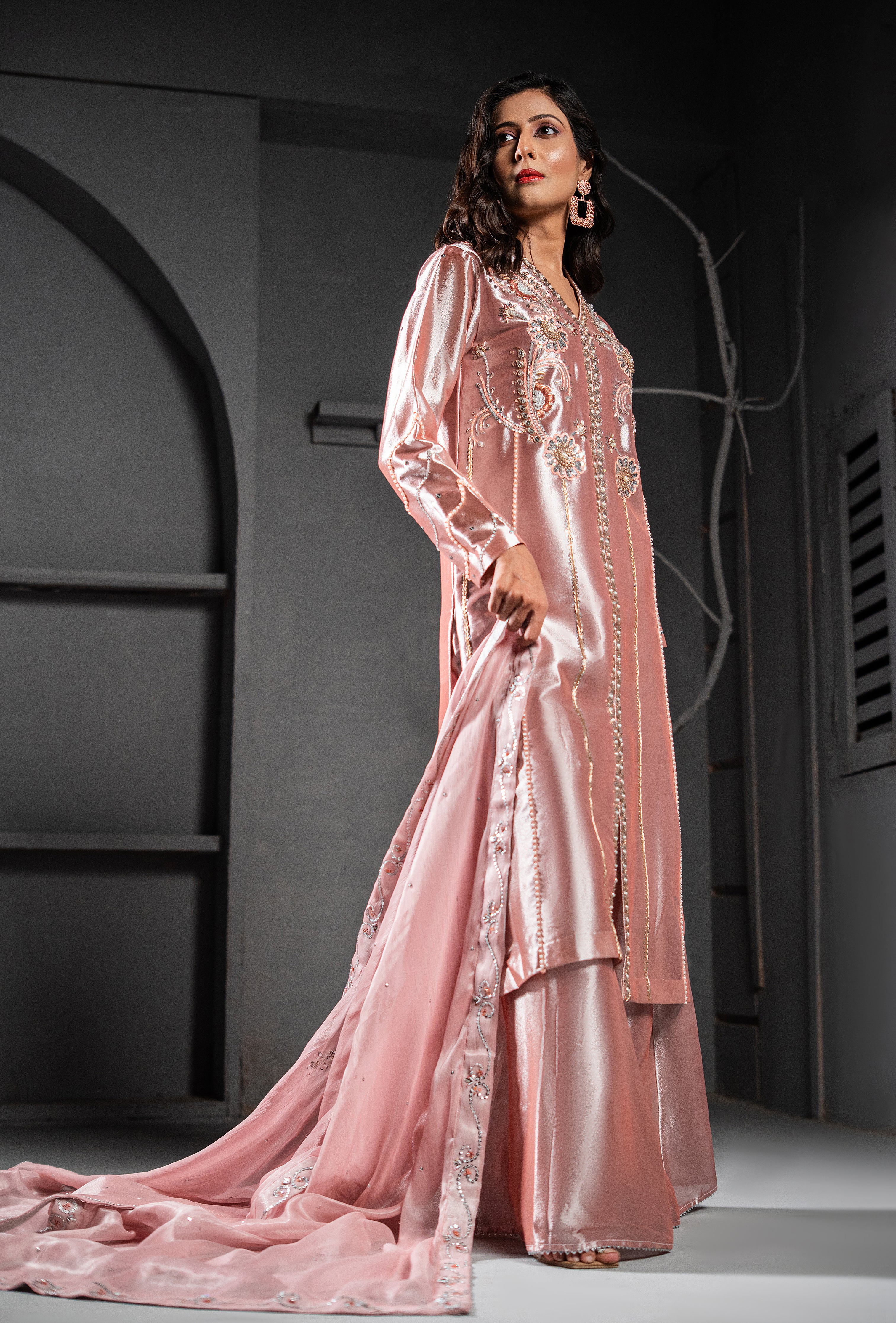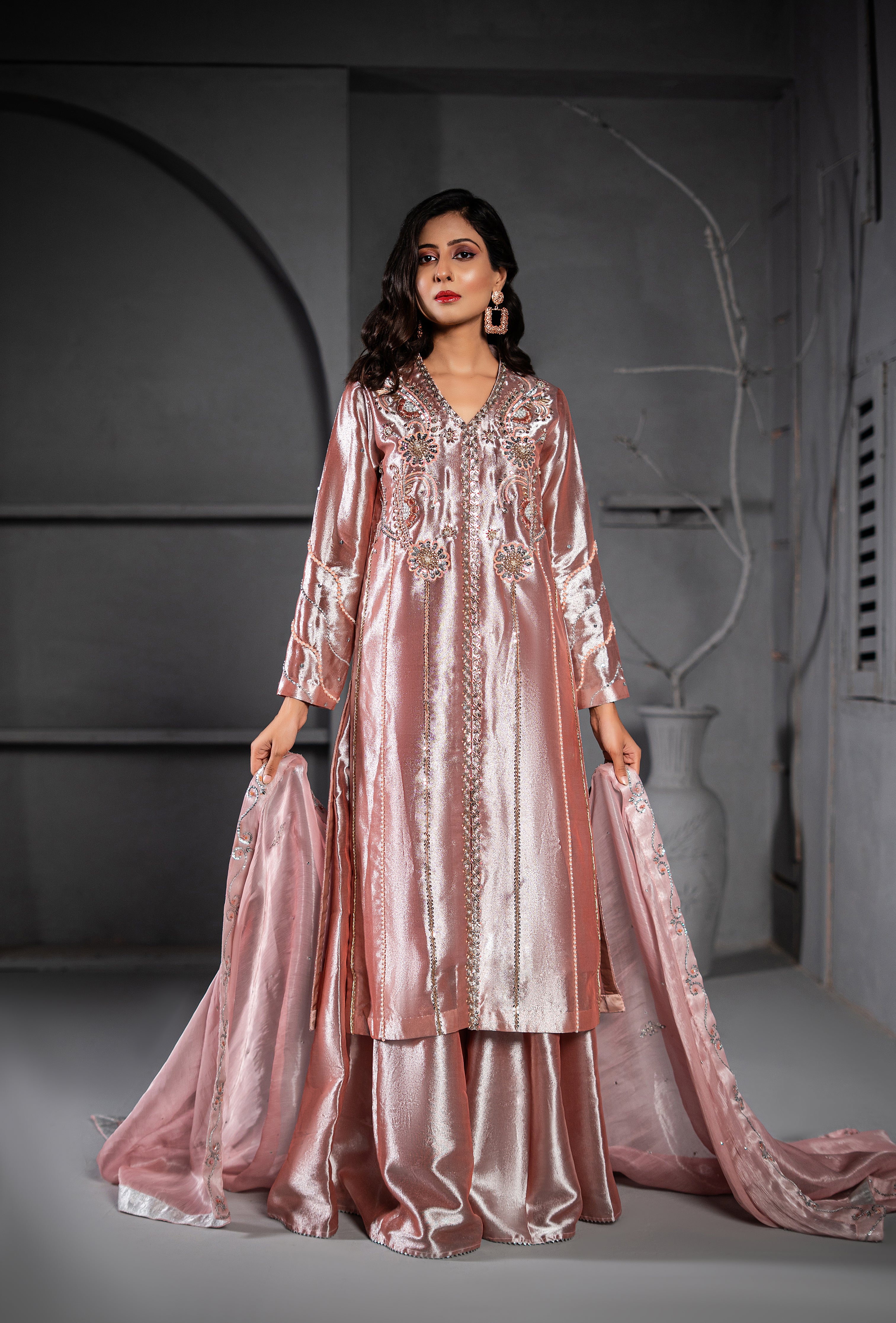 Exude understated elegance in this stunning ensemble featuring a tea pink Lamé tissue front-open style long shirt. Paired with matching plazo pants crafted from the same luxurious fabric, this outfit is perfect for formal occasions. The Masoori fabric dupatta, adorned with intricate hand embroidery, adds a touch of sophistication and completes the look.